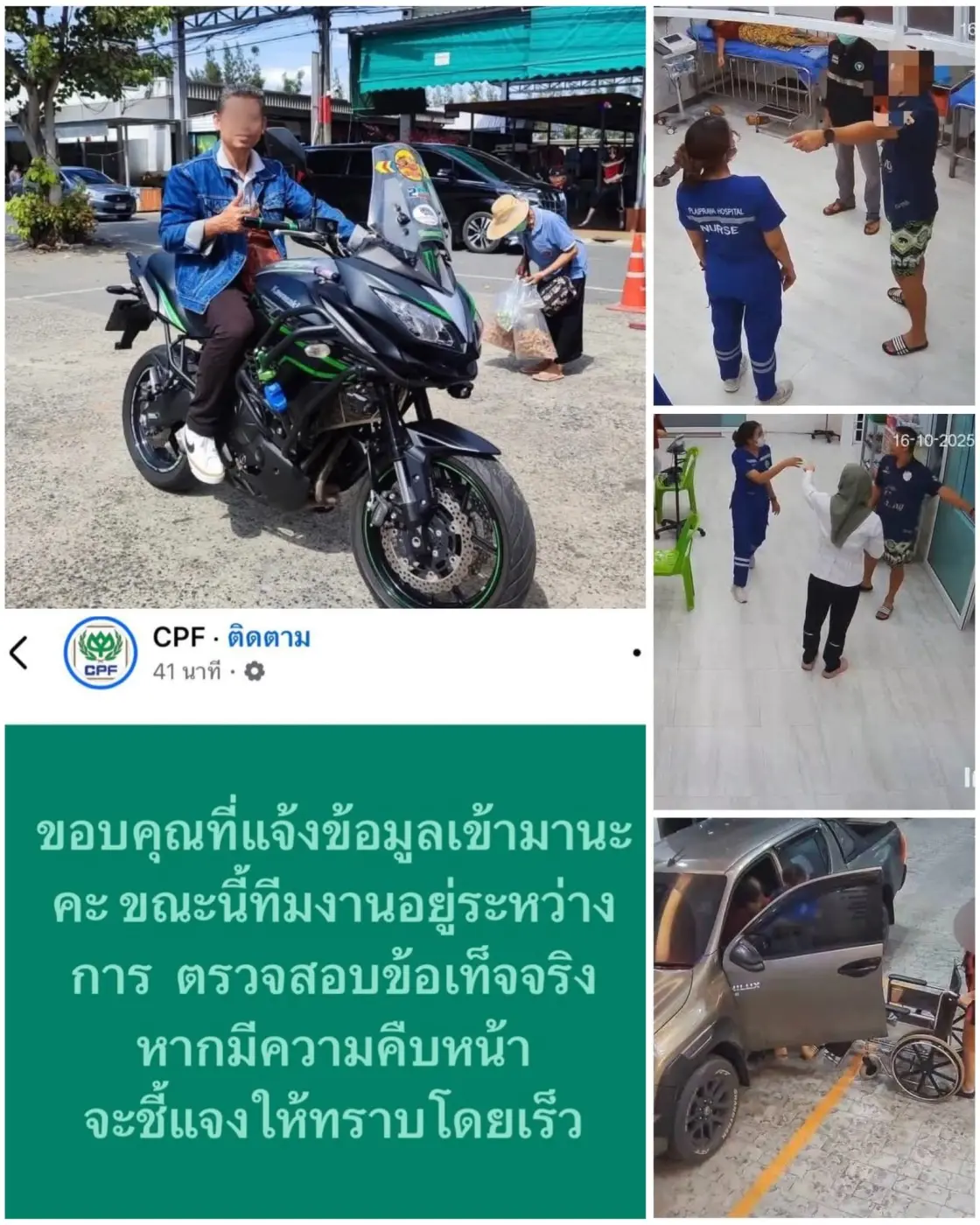 ผู้สื่อข่าวรายงานว่า จากกรณีที่มีชายคนขับรถกระบะที่ขวางรถพยาบาลจนเป็นเหตุให้ผู้เสียชีวิต ล่าสุดได้รับทราบจากพลเมืองดีว่า ชายผู้ก่อเหตุดังกล่าวเป็นพนักงานบริษัท CPF ล่าสุดบริษัทรับทราบเรื่องแล้ว และอยู่ระหว่างตรวจสอบข้อเท็จจริง