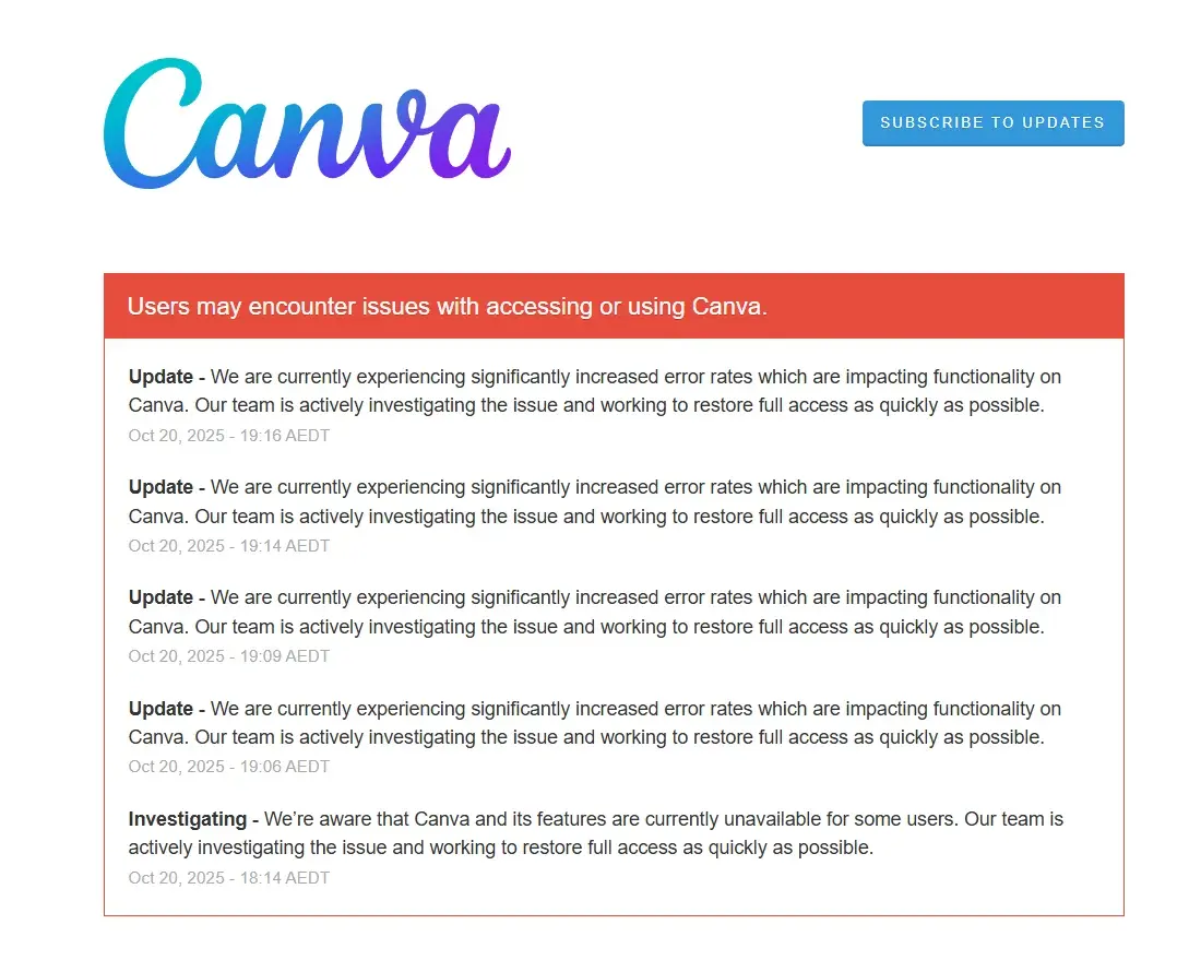 จากภาพหน้าสถานะ (Status Page) ของ Canva ที่อัปเดตล่าสุด ยืนยันว่า Canva กำลังประสบปัญหาระบบล่ม โดยระบุว่ากำลังเผชิญกับ "error rates ที่สูงขึ้นอย่างมีนัยสำคัญ" (significantly increased error rates) ซึ่งส่งผลกระทบต่อการทำงานโดยรวม และก่อนหน้านี้ (18:14 AEDT) ยอมรับว่า "Canva และฟีเจอร์ต่างๆ ไม่สามารถใช้งานได้สำหรับผู้ใช้บางส่วน"