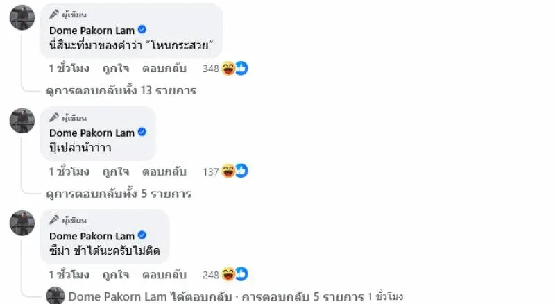 เรื่องนี้กลายเป็นไฟลุกบนโซเชียลทันที เพราะหลายคนต่างตีความในมุมต่าง ๆ ขณะที่เจ้าตัวอย่างโดม ปกรณ์ ลัม ก็ไม่ปล่อยให้เรื่องเงียบ รีบเคลื่อนไหวตอบกลับด้วยข้อความสุดฮาแต่มีแววประชดว่า