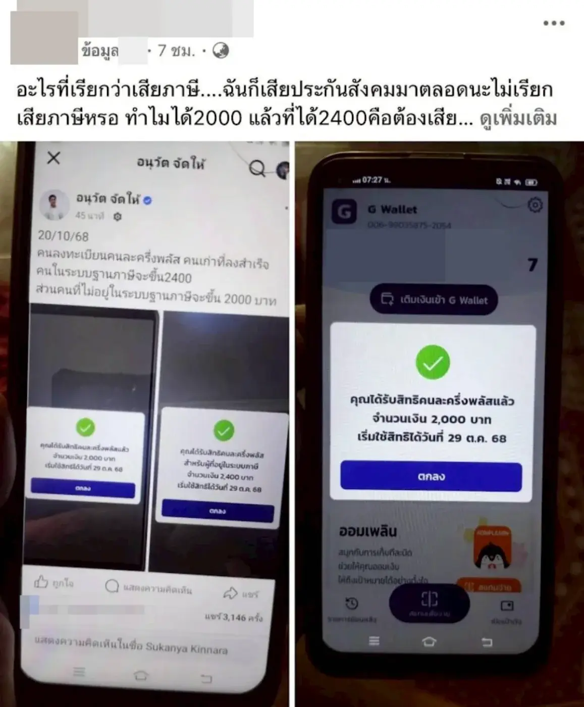 "อะไรทีเรียกว่าเสียภาษี ฉันก็เสียประกันสังคมมาตลอด ทำไมได้ 2,000 บาท ส่วนคนที่ได้ 2,400 บาท ต้องเสียภาษีแบบไหน #วัดจากอะไร"