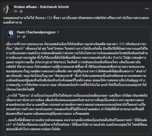 เรียกว่ากลายเป็นประเด็นดราม่า และสังคมต่างก็ให้ความสนใจ หลังทาง สส.ไอซ์ รักชนก ได้ออกมาโพสต์ข้อความลงโซเชียลเมื่อวันที่ 21 ต.ค.68 โดยกล่าวหาทาง "กัน จอมพลัง" อย่างรุนแรงว่า "ที่หยิบเอา ม.112 ขึ้นมาพูด เพราะจนมุมตอบคำถามไม่ได้ใช่มั๊ย เลยเอาเรื่องสถาบันพระมหากษัตริย์มาเป็นเกราะกำบังให้ตัวเอง"