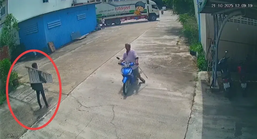 กล้องชัด!โจรบุกลักบันไดอลูมิเนียมกลางวันแสกๆ ตีเนียนรับจ้างตัดหญ้า
