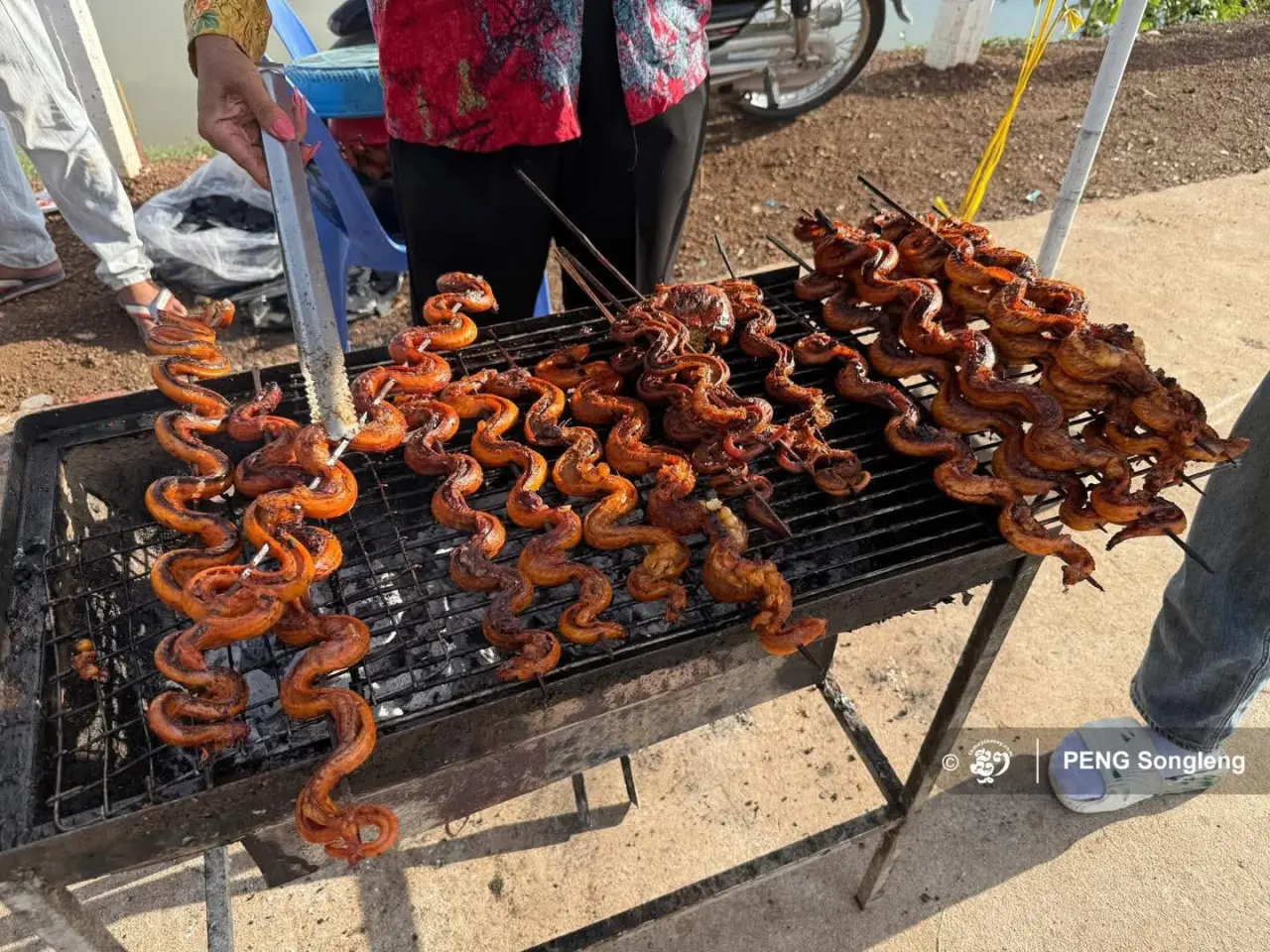 “ซวน เยิร์น” แม่ค้าริมทางในอำเภอเปียมโร จังหวัดแปรยแวง กล่าวว่า ทุกปีช่วงหน้าฝนเธอจะขายงูย่าง ซึ่งเป็นเมนูยอดนิยมของชาวกัมพูชา โดยรับซื้องูจากชาวบ้านในราคาตัวละ 10,000–15,000 เรียล ส่วนใหญ่เป็น งูหางกระดิ่ง และ งูเห่า