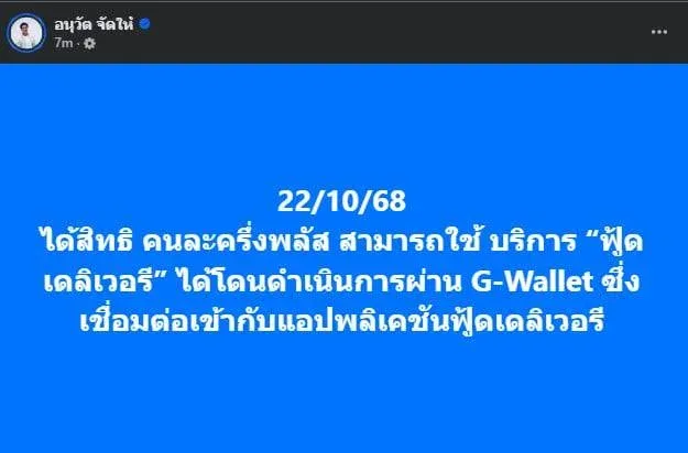เพจ อนุวัต จัดให้ ระบุว่า ผู้ใช้สิทธิ์สามารถสั่งอาหารออนไลน์ผ่านแอปพลิเคชันเดลิเวอรี่ได้ตั้งแต่วันที่ 7 พฤศจิกายน 2568 เป็นต้นไป