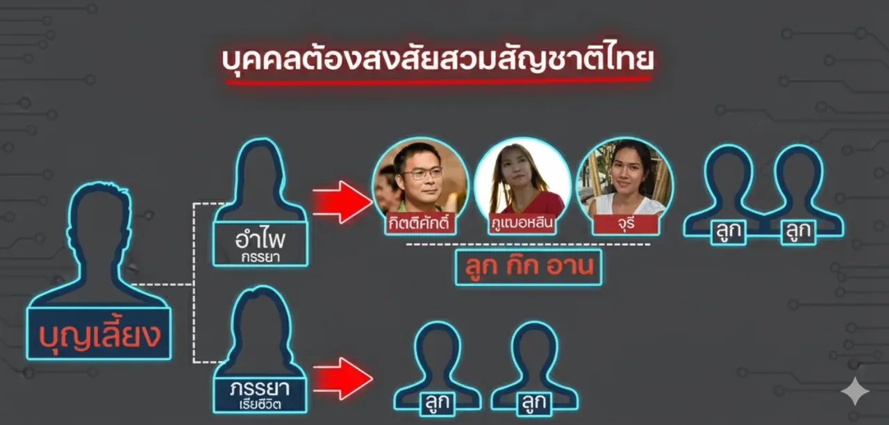 จากการสืบสวนของ DSI พบว่านายบุญเลี้ยง คล่องกิจกล มีการแจ้งเกิดลูกสัญชาติไทยรวมทั้งหมด 24 คน จากภรรยา 6 คน จำนวน 3 คน ใน 24 คน มีชื่อตรงกับชื่อลูก ก๊ก อาน นักธุรกิจ เจ้าพ่อกาสิโน ในปอยเปต และเป็นคนสนิท ฮุนเซน