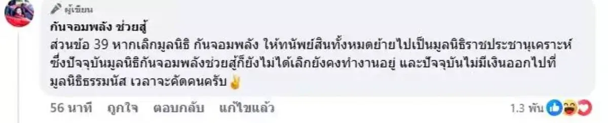“ตอนนี้มูลนิธิยังทำงานอยู่ ไม่มีการยุบ ไม่มีการโอนเงินไปที่มูลนิธิอื่น ๆ ผมอยากให้ประชาชนเห็นว่าเราโปร่งใสและทำงานจริง”