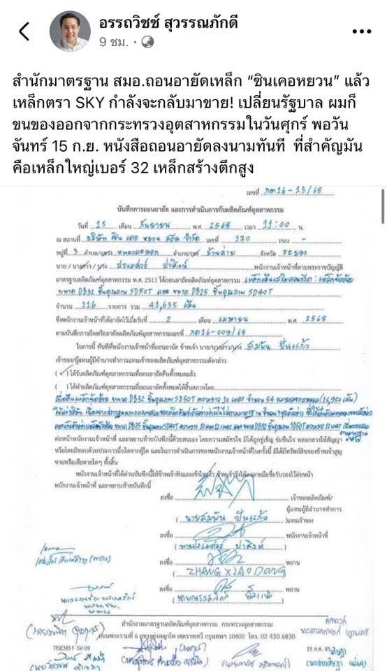 อรรถวิชช์ ฟาดเปลี่ยนรัฐบาลถอนอายัดทันที เหล็ก SKYY สร้างตึกสตง. เหล็กเบอร์ 32 กลับมาขาย ใช้สร้างตึกสูง