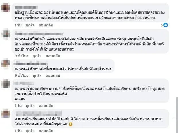 หมอสั่งให้ทำ MRI สมอง เพื่อตรวจหาความผิดปกติ และผลออกมาว่า ยังไม่มีสมองตาย ไม่มีเลือดออก และไม่มีเนื้องอก ซึ่งถือว่าเป็นข่าวดีอย่างหนึ่ง