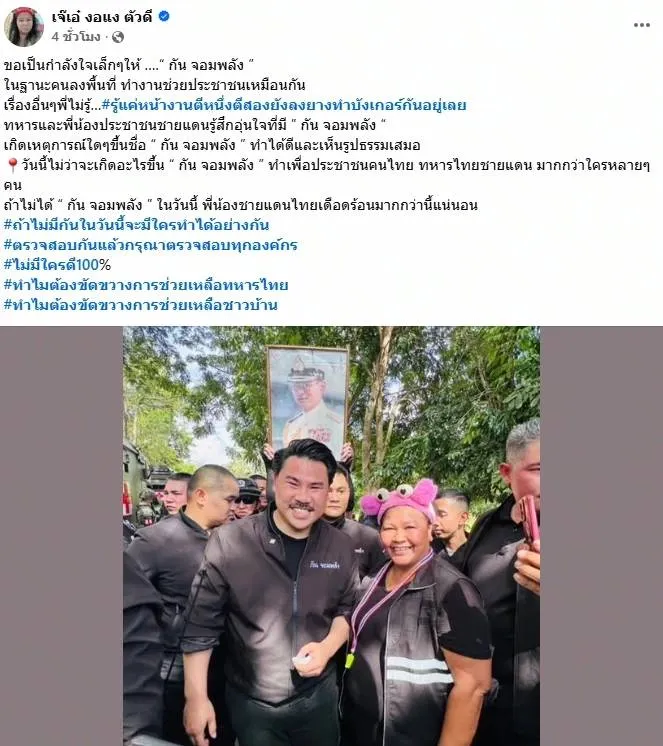 "ขอเป็นกำลังใจเล็กๆ ให้ ‘กัน จอมพลัง’ ในฐานะคนลงพื้นที่ ทำงานช่วยประชาชนเหมือนกัน เรื่องอื่นๆ พี่ไม่รู้... แต่รู้แค่หน้างานตีหนึ่งตีสอง ยังลงยางทำบังเกอร์กันอยู่เลย ทหารและพี่น้องประชาชนชายแดนรู้สึกอุ่นใจที่มี ‘กัน จอมพลัง’ เกิดเหตุการณ์ใดๆ ขึ้นชื่อ ‘กัน จอมพลัง’ ทำได้ดี และเห็นรูปธรรมเสมอ"