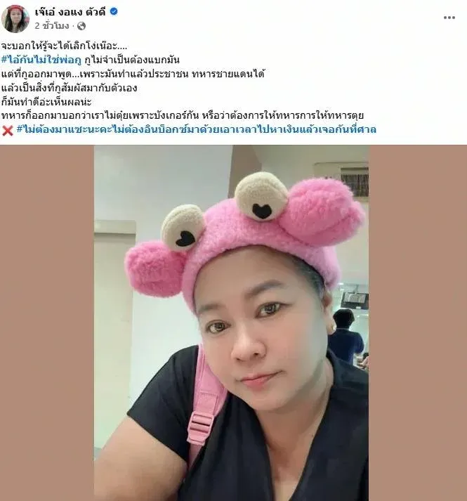 เธอชี้ให้เห็นว่า การทำงานเพื่อประชาชนและทหารชายแดนต้อง อาศัยความเสียสละ ความอดทน และความมุ่งมั่น ไม่ใช่แค่การสร้างภาพลักษณ์บนโลกออนไลน์