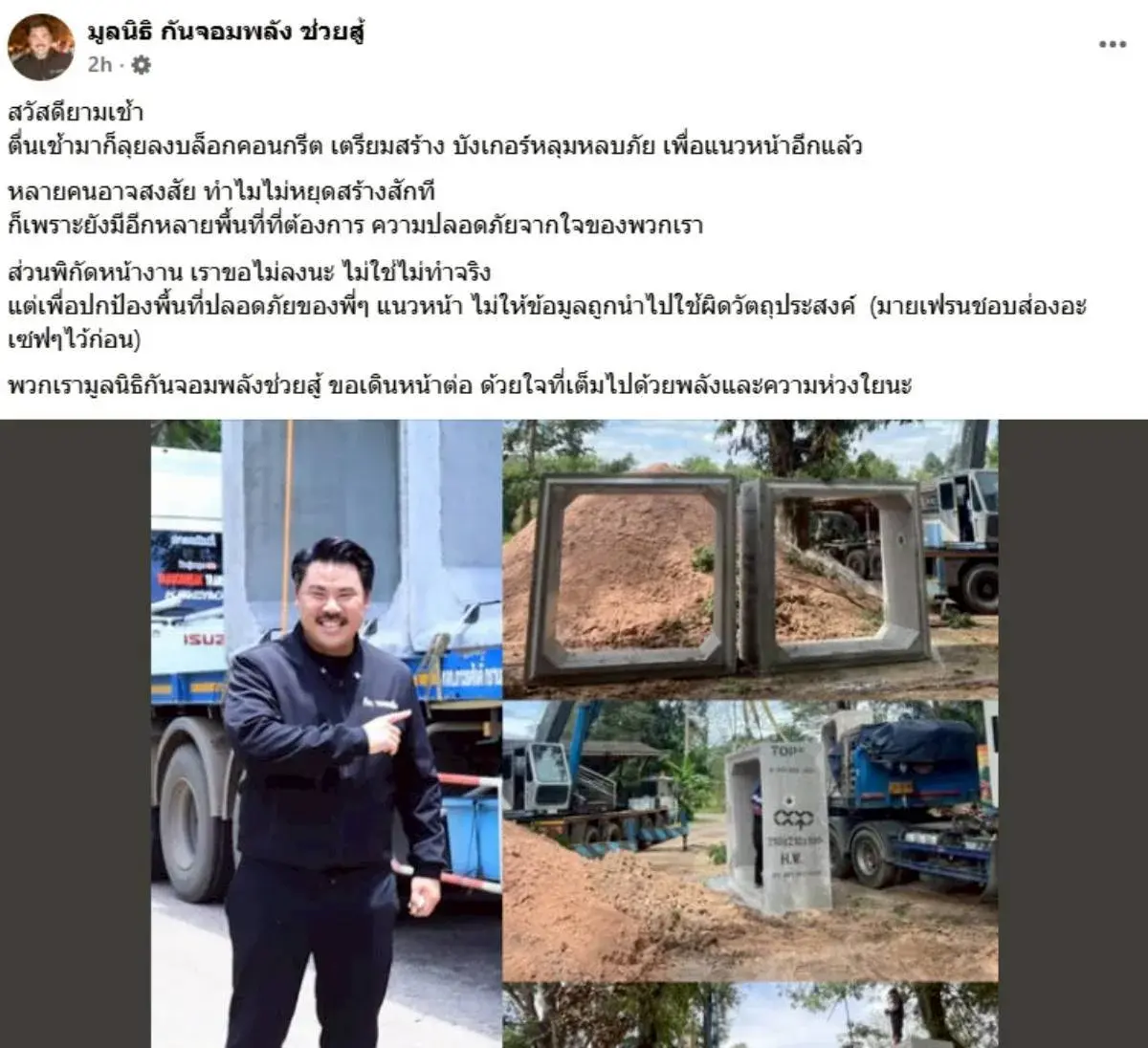 "ตื่นเช้ามาก็ลุยลงบล็อกคอนกรีต เตรียมสร้างบังเกอร์หลุมหลบภัยเพื่อแนวหน้าอีกแล้ว หลายคนอาจสงสัย ทำไมไม่หยุดสร้างสักที ก็เพราะยังมีหลายพื้นที่ที่ต้องการความปลอดภัยจากใจของพวกเรา"