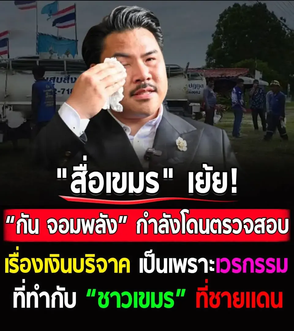 โดยในรายงานของสื่อเขมรระบุว่า ขณะนี้ “กัน จอมพลัง” กำลังถูกหน่วยงานไทยตรวจสอบเรื่อง “เงินบริจาค” ที่เกี่ยวข้องกับการทำกิจกรรมช่วยเหลือประชาชน ซึ่งสื่อเขมรบางแห่งตีความไปในทางลบ พร้อมพาดหัวข่าวแรงว่า “เป็นผลกรรมจากการกระทำต่อคนเขมร”