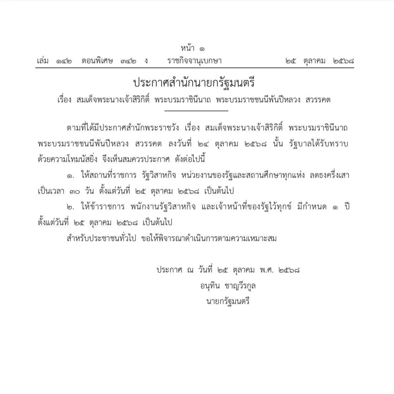 รัฐบาลขอความร่วมมือภาคธุรกิจบันเทิง–สถานบันเทิง งดกิจกรรมรื่นเริง เป็นเวลา 30 วัน ภายหลังการเสด็จสวรรคตของสมเด็จพระนางเจ้าสิริกิติ์ พระบรมราชินีนาถ พระบรมราชชนนีพันปีหลวง