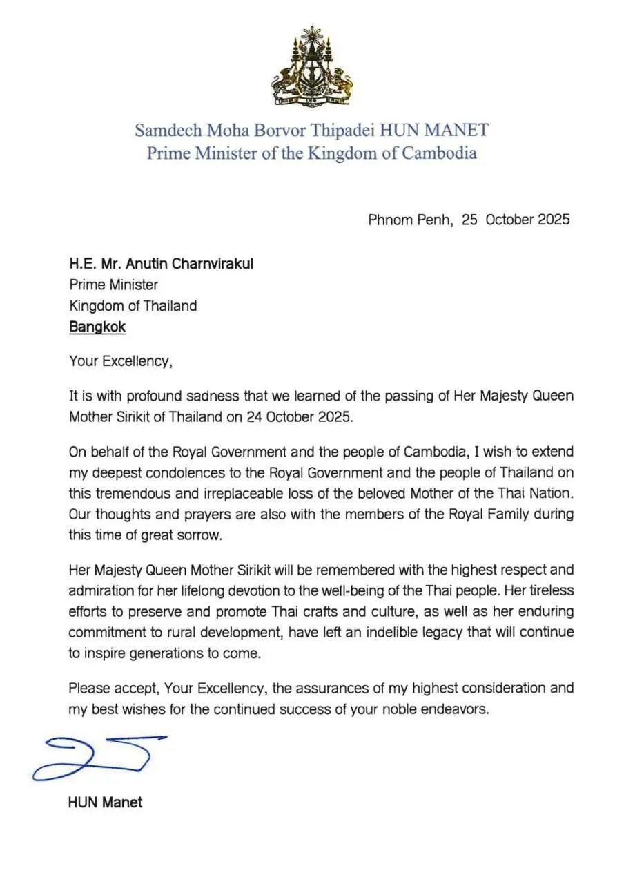 วันที่ 25 ต.ค. ฮุนมาเนต นายกรัฐมนตรีกัมพูชา ส่งหนังสือแสดงความอาลัย ถึง นายอนุทิน ชาญวีรกูล นายกรัฐมนตรี ต่อการสวรรคต ของ สมเด็จพระนางเจ้าสิริกิติ์ พระบรมราชินีนาถ พระบรมราชชนนีพันปีหลวง ระบุว่า
