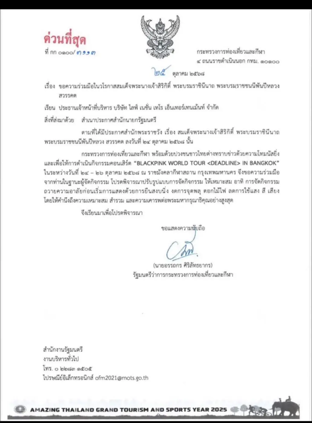 และเพื่อให้การดำเนินกิจกรรมคอนเสิร์ต “BLACKPINK WORLD TOUR <DEADLINE> IN BANGKOK” ในระหว่างวันที่ 24-26 ตุลาคม 2568 ณ ราชมังคลากีฬาสถาน กรุงเทพมหานคร จึงขอความร่วมมือจากท่านในฐานะผู้จัดกิจกรรม โปรดพิจารณาปรับรูปแบบการจัดกิจกรรมให้เหมาะสม อาทิ การจัดกิจกรรม ถวายความอาลัยก่อนเริ่มการแสดงด้วยอาการยืนสงบนิ่ง งดการจุดพลุ ดอกไม้ไฟ ลดการใช้แสง สี เสียง โดยให้คึงถึงความเหมาะสม สำรวม และความเคารพต่อพระมหากรุณาธิคุณอย่างสูงสุด