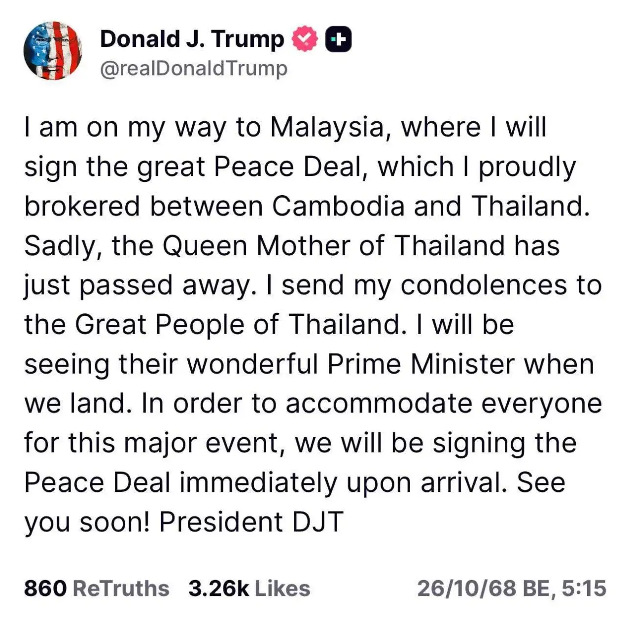 วันที่ 26 ตุลาคม – สื่อทั่วโลกให้ความสนใจอย่างมาก หลัง โดนัลด์ เจ. ทรัมป์ อดีตประธานาธิบดีสหรัฐฯ ออกมาโพสต์ข้อความผ่านโซเชียลมีเดียส่วนตัว ระบุว่า เขากำลังเดินทางมายังประเทศ มาเลเซีย เพื่อเข้าร่วม “พิธีลงนามในข้อตกลงสันติภาพ” ระหว่าง ประเทศไทยและกัมพูชา โดยทรัมป์ย้ำว่าตนเองจะทำหน้าที่เป็น “ผู้ไกล่เกลี่ย” เพื่อสร้างสันติภาพและความร่วมมือระหว่างสองประเทศเพื่อนบ้านในเอเชียตะวันออกเฉียงใต้