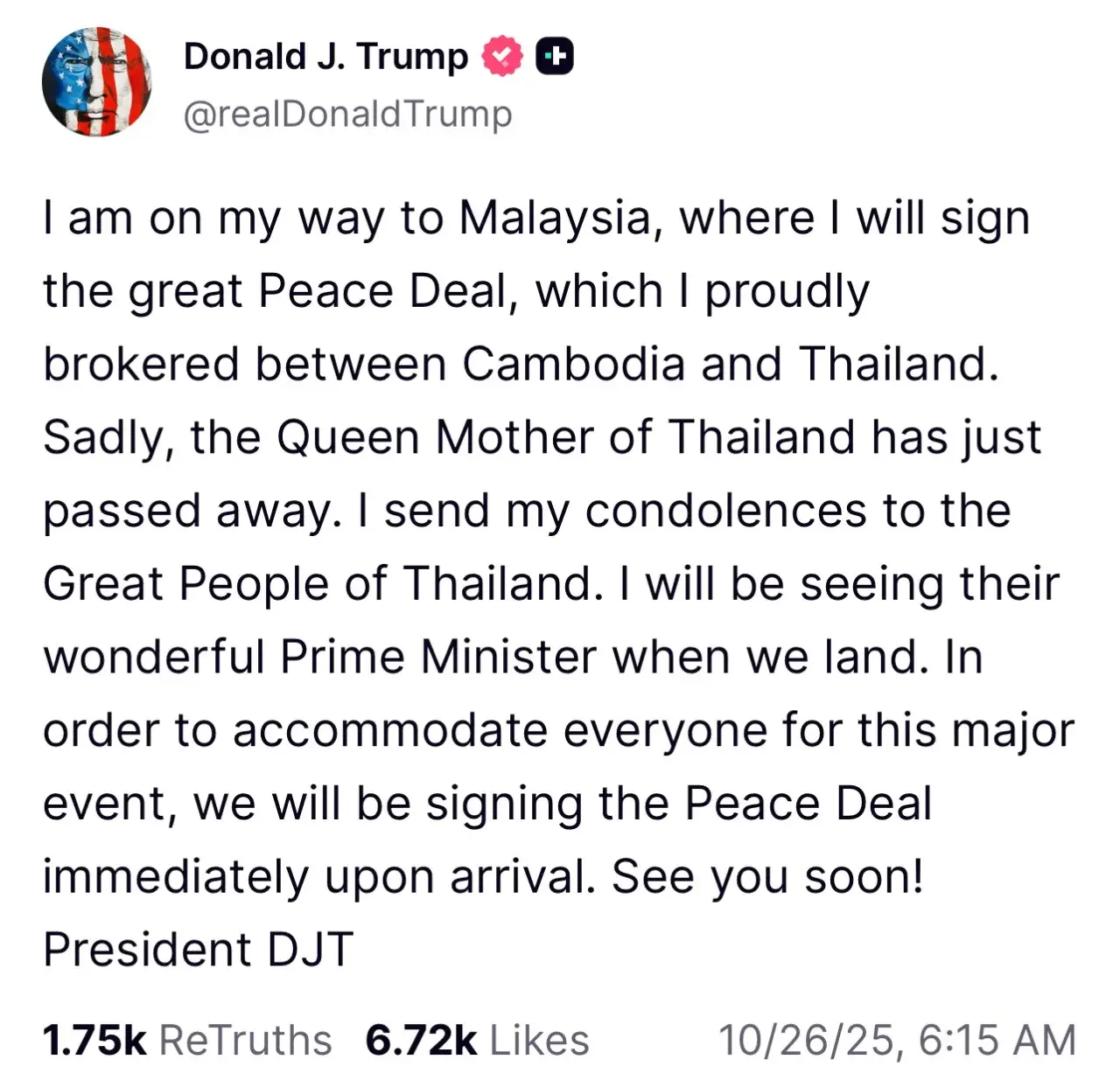 วันนี้ (26 ต.ค. 68) เวลาประมาณ 06.15 น. นายโดนัลด์ ทรัมป์ ประธานาธิบดีสหรัฐอเมริกา โพสต์ข้อความผ่าน Truth Social แสดงความอาลัยต่อการสวรรคตของ สมเด็จพระนางเจ้าสิริกิติ์ พระบรมราชินีนาถ พระบรมราชชนนีพันปีหลวง ระบุข้อความแปลเป็นภาษาไทยว่า "ข้าพเจ้าอยู่ระหว่างการเดินทางไปประเทศมาเลเซียเพื่อลงนามสัญญาสันติภาพไทย-กัมพูชา แต่ช่างเป็นเรื่องที่น่าเศร้าเมื่อทราบข่าวการสวรรคตของสมเด็จพระนางเจ้าสิริกิติ์ พระบรมราชินีนาถ พระบรมราชชนนีพันปีหลวง แห่งประเทศไทย ข้าพเจ้าขอแสดงความเสียใจอย่างสุดซึ้งต่อปวงชนชาวไทย