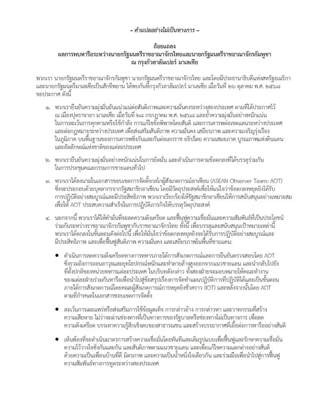 เปิดเอกสารลงนาม 4 ฝ่าย ยุติปัญหาชายแดนไทย-กัมพูชา ทรัมป์-อันวาร์เป็นพยานร่วม
