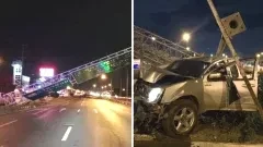 ทางหลวงแจ้งความแน่ กระบะพุ่งชน 'ป้ายบอกทางขนาดใหญ่' หักโค่น ทำกาญจนาภิเษกติดหนึบทุกช่องทาง