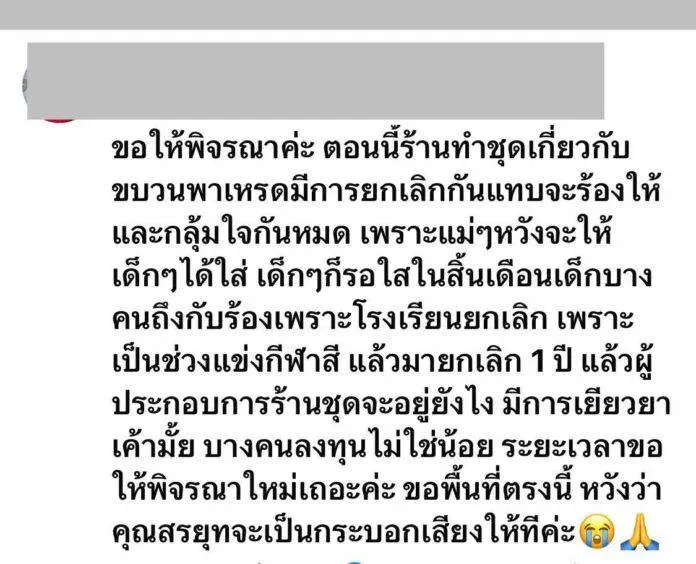 "ขอให้พิจารณาค่ะ ตอนนี้ร้านค้าชุดเกี่ยวกับขบวนพาเหรด มีการยกเลิกกัน แทบจะร้องไห้และกลุ้มใจกันหมด เพราะแม่ๆ หวังจะให้เด็กๆ ได้ใส่ เด็กๆ ก็รอใส่ในสิ้นเดือน เด็กบางคนถึงกับร้องเพราะโรงเรียนยกเลิก เพราะเป็นช่วงแข่งกีฬาสี แล้วมายกเลิก 1 ปี ผู้ประกอบการร้านชุดจะอยู่ยังไง มีการเยียวยาหรือไม่ บางคนลงทุนไม่ใช่น้อย ระยะเวลาขอให้พิจารณาใหม่เถอะค่ะ"