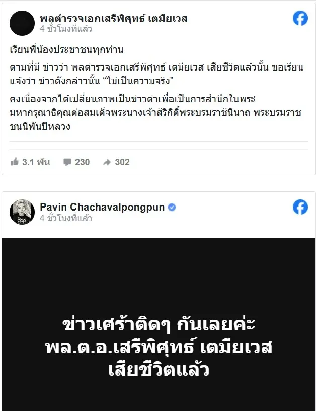 ทางด้าน รศ.ดร.ปวิน ชัชวาลพงศ์ ซึ่งเป็นอาจารย์ด้านเอเชียตะวันออกเฉียงใต้ศึกษา ประจำมหาวิทยาลัยเกียวโต ที่ประเทศญี่ปุ่น ก็ได้ออกโพสต์เฟคนิวส์ ระบุว่า "ข่าวเศร้าติดๆ กันเลยค่ะ พล.ต.อ.เสรีพิศุทธ์ เตมียเวส เสียชีวิตแล้ว"