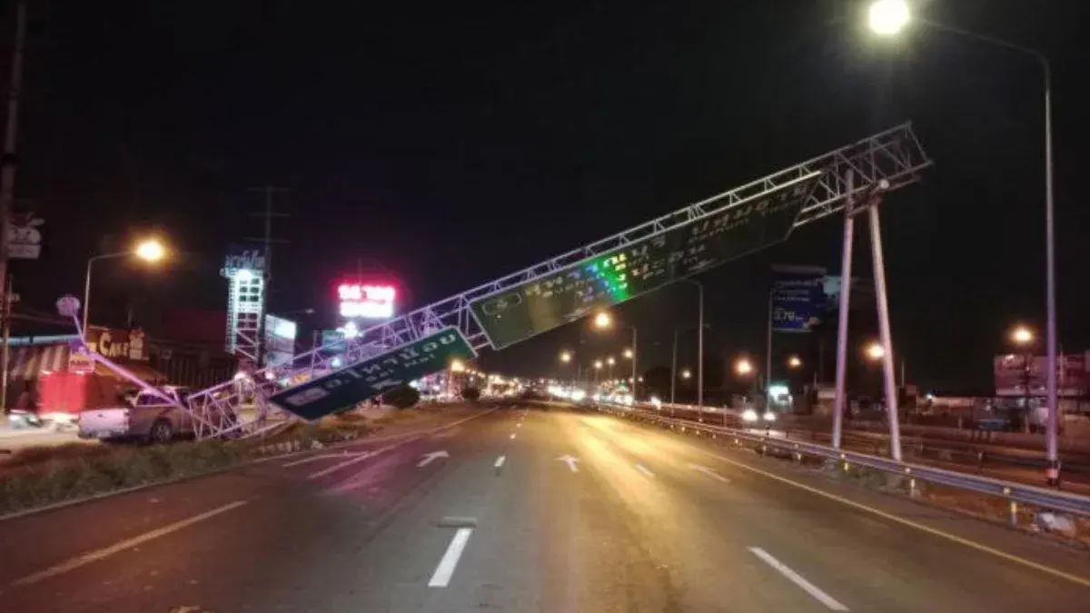 ทางหลวงแจ้งความแน่ กระบะพุ่งชน 'ป้ายบอกทางขนาดใหญ่' หักโค่น ทำกาญจนาภิเษกติดหนึบทุกช่องทาง