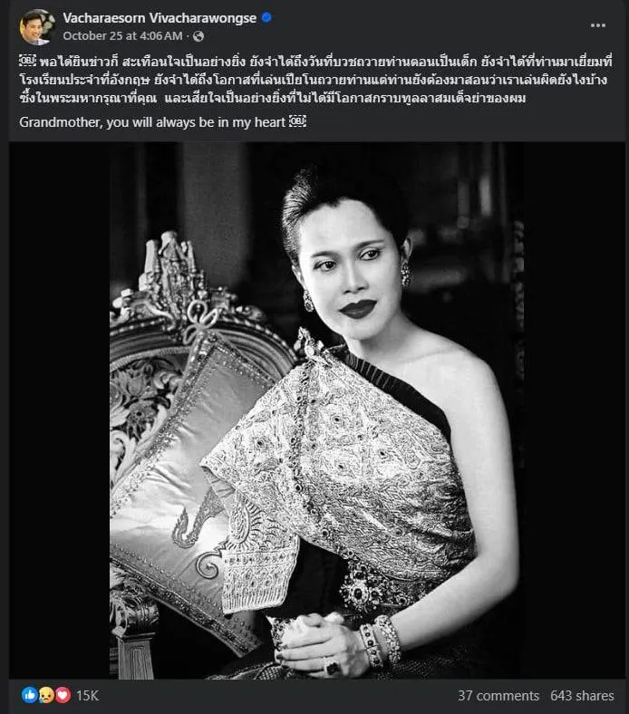 วันที่ 25 ตุลาคม 2568 – บนโลกออนไลน์ได้เกิดกระแสซาบซึ้งและอบอุ่นหัวใจขึ้นอีกครั้ง เมื่อ “ท่านอ้น วัชรเรศร วิวัชรวงศ์” ได้โพสต์ข้อความระลึกถึง “สมเด็จพระพันปีหลวง” ด้วยความอาลัยอย่างสุดซึ้ง หลังทราบข่าวการเสด็จสวรรคต โดยในถ้อยคำที่ท่านอันบรรจงเขียนไว้นั้น เต็มไปด้วยความรัก ความเคารพ และความผูกพันอันลึกซึ้งที่มีต่อ “สมเด็จย่า” ผู้ทรงเป็นเสมือนแสงนำทางในชีวิตตั้งแต่วันเยาว์