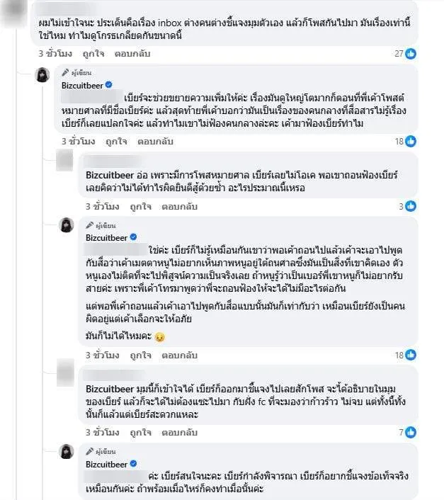 “เบียร์จะช่วยขยายความเพิ่มให้ค่ะ เรื่องมันดูใหญ่โตมากก็ตอนที่พี่เขาโพสต์หมายศาลที่มีชื่อเบียร์ค่ะ”
