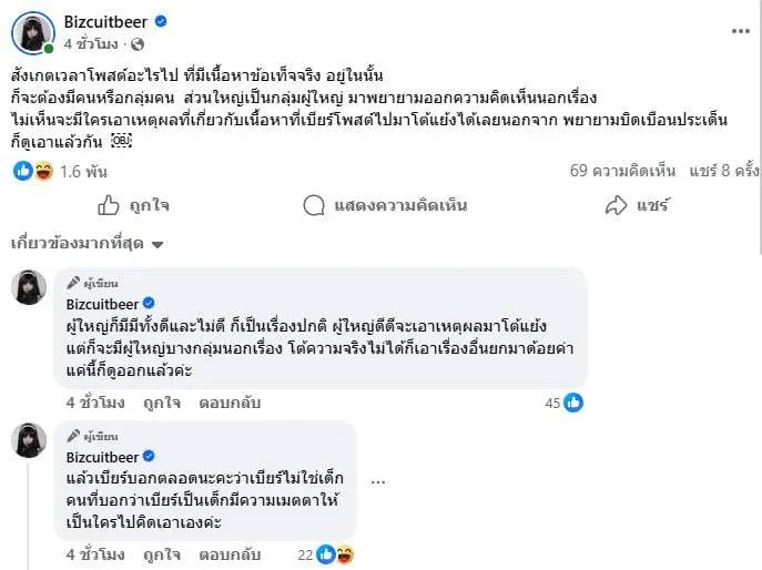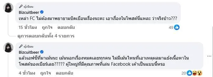 “แล้วเอฟซีที่มาเม้นนะ เม้นนอกเรื่องหมดเลยทุกคน ไม่มีเม้นไหนที่เอาเหตุผลมาโต้เนื้อหาในโพสต์ของเบียร์เลย????? ผู้ใหญ่ที่มีคุณภาพที่เล่น Facebook เค้าเป็นแบบนี้หรอ”