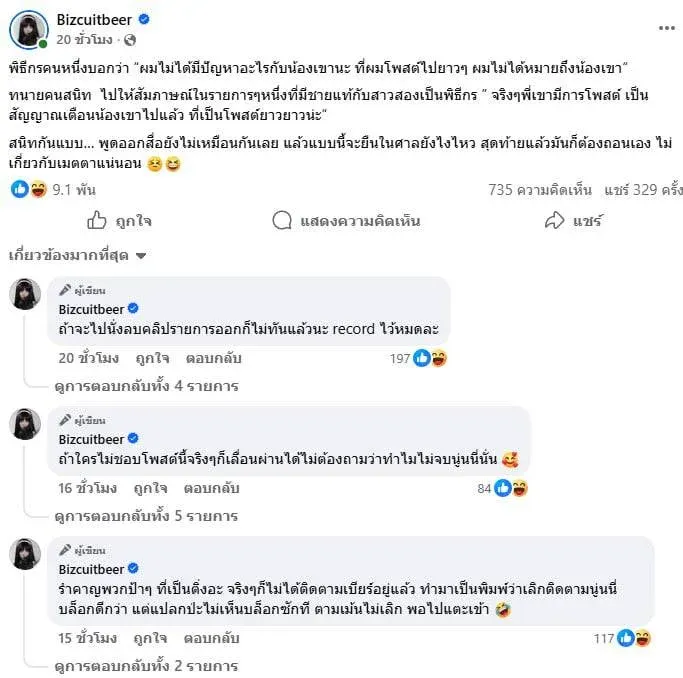 เบียร์ได้โพสต์ข้อความผ่านเฟซบุ๊ก Bizcuitbeer โดยระบุถึงสถานการณ์ว่า: “พิธีกรคนหนึ่งบอกว่า ‘ผมไม่ได้มีปัญหาอะไรกับน้องเขานะ’ ที่โพสต์ไปยาว ๆ จริง ๆ พี่เขามีการโพสต์เป็นสัญญาณเตือนน้องเขาไปแล้ว ซึ่งเป็นโพสต์ยาว ๆ แบบนั้น … สนิทกันแบบ… พูดออกสื่อยังไม่เหมือนกันเลย แล้วแบบนี้จะยืนในศาลยังไงไหว สดท้ายแล้วมันก็ต้องถอนเอง ไม่เกี่ยวกับเมตตาแน่นอน”