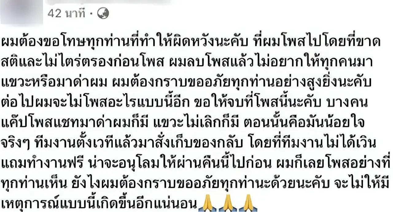 ภายหลัง เจ้าตัวได้อธิบายเพิ่มเติมถึงสาเหตุของ “อารมณ์ชั่ววูบ” ว่า วันนั้นมีงานแสดงที่เตรียมการไว้เรียบร้อย ทั้งเวที ระบบไฟ แสง สี เสียง และพ่อค้าแม่ค้าจำนวนมากที่ลงทุนมาตั้งร้านขายของ แต่จู่ ๆ กลับได้รับแจ้งจากผู้จัดงานว่า “งานถูกยกเลิก” โดยให้เหตุผลว่ามีคำสั่งจากข้าราชการให้ระงับการจัดงาน เขารู้สึกเสียใจแทนทุกคนที่เตรียมตัวและลงทุนลงแรงไป ทำให้เกิดความไม่พอใจและหลุดโพสต์ข้อความที่ไม่ควรออกไปในช่วงอารมณ์นั้น