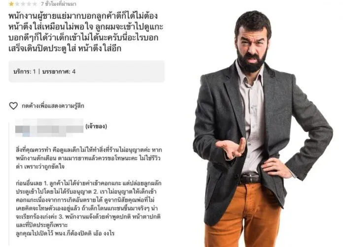 ลูกค้าหนุ่มได้รีวิวคาเฟ่แห่งหนึ่งให้ 1 ดาว เนื่องจากบริการไม่ดี โดยกล่าวว่าพนักงานปิดประตูใส่หน้าเขาและมีท่าทางไม่พอใจ เจ้าของร้านได้ตอบโต้โดยชี้ให้เห็นว่าลูกค้าไม่ควรปล่อยให้เด็กเข้าไปในพื้นที่ที่ไม่อนุญาต และว่าพนักงานได้เตือนตามมารยาทแล้ว เจ้าของยังกล่าวว่าหากเด็กเกิดอันตรายขึ้นมา ลูกค้าจะเป็นคนเรียกร้องความรับผิดชอบ นอกจากนี้ยังมีการพูดถึงภาพจากกล้องวงจรปิดที่สามารถยืนยันเหตุการณ์ได้ หลายคนในโซเชียลมีเดียแสดงความคิดเห็นเกี่ยวกับการตอบโต้ของร้าน บางคนชื่นชมความตรงไปตรงมา ขณะที่บางคนมองว่าควรมีวิธีการสื่อสารที่ดีกว่านี้