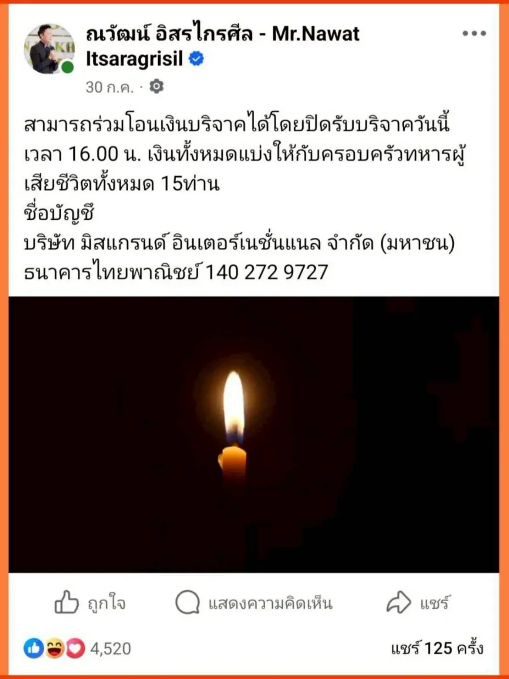 เรื่องราวไม่ได้จบแค่ตำแหน่งประธาน แต่ยังลุกลามไปถึงการโอนเงินจำนวน 50,000 บาท ให้กับ “บอส” ณวัฒน์ อิสรไกรศีล ประธานบริษัท มิสแกรนด์ อินเตอร์เนชั่นแนล โดยในรายการ Phutta Talk เมื่อค่ำคืนก่อนหน้า มีการเปิดเผยว่า กัน จอมพลัง ได้โอนเงินดังกล่าวไปยังบัญชีของบอส ณวัฒน์เอง ซึ่งฝ่าย ณวัฒน์ออกมาชี้แจงว่าตนยินดีรับบริจาคจากประชาชนจริง แต่ยอดเงินที่ได้รับนั้นมีจำนวนรวมเพียงประมาณ 2 แสนกว่าบาท และใช้ช่วยเหลือครอบครัวของทหารผู้เสียชีวิตทั้งหมด 13 ร่าง