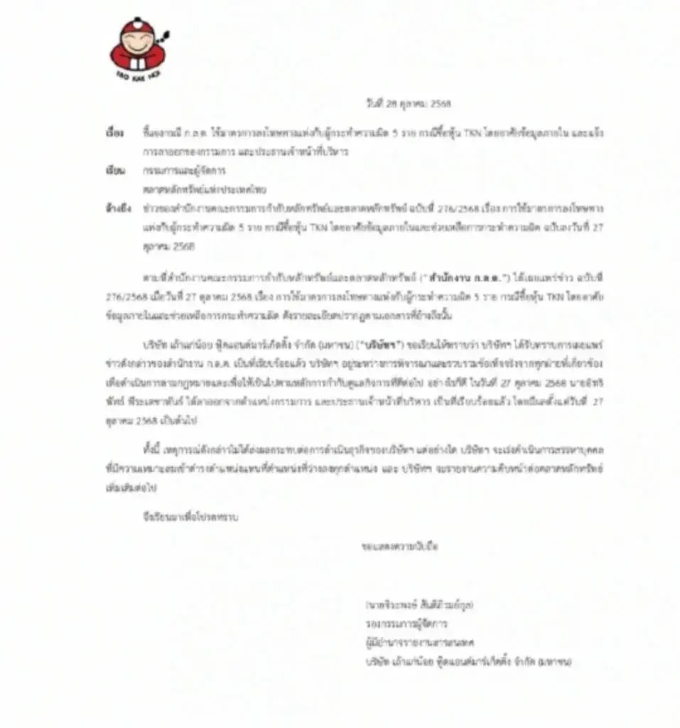 สำนักงานคณะกรรมการกำกับหลักทรัพย์และตลาดหลักทรัพย์ (ก.ล.ต.) ได้ออกประกาศสำคัญที่สร้างความสนใจอย่างมากในวงการตลาดทุนไทย 🏦 เนื่องจากมีการดำเนินคดี บุคคล 5 ราย ในกรณี ซื้อขายหุ้นบริษัท เถ้าแก่น้อย ฟู้ดแอนด์มาร์เก็ตติ้ง จำกัด (มหาชน) หรือ TKN โดยใช้ข้อมูลภายใน (Insider Trading) ซึ่งถือเป็นความผิดร้ายแรงตามกฎหมายหลักทรัพย์และตลาดหลักทรัพย์ พ.ศ. 2535