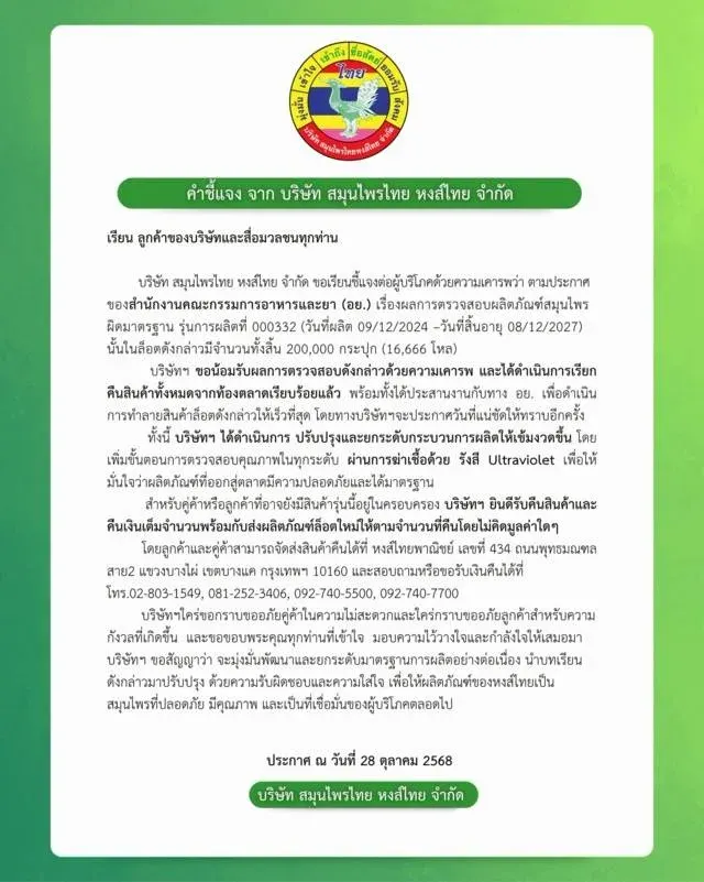 กลายเป็นข่าวใหญ่ในวงการสุขภาพและผลิตภัณฑ์สมุนไพรไทย เมื่อวันที่ 28 ตุลาคม 2568 ที่ผ่านมา บริษัท สมุนไพรไทย หงส์ไทย จำกัด หนึ่งในผู้ผลิตผลิตภัณฑ์สมุนไพรชื่อดังของประเทศไทย ได้ออกแถลงการณ์อย่างเป็นทางการเกี่ยวกับการ เรียกคืนผลิตภัณฑ์ล็อต 000332 รวมกว่า 200,000 กระปุก หลังได้รับการแจ้งจาก สำนักงานคณะกรรมการอาหารและยา (อย.) ว่าผลการตรวจสอบผลิตภัณฑ์ในล็อตดังกล่าว ไม่ผ่านมาตรฐานความปลอดภัย