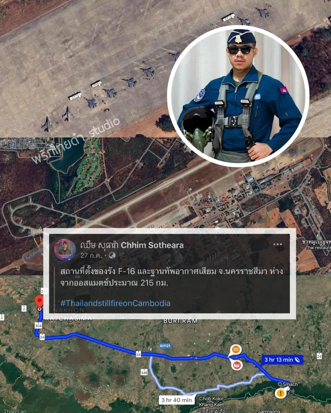 เกิดประเด็นร้อนในโลกออนไลน์อีกครั้ง เมื่อทหารอากาศของ “กัมพูชา” รายหนึ่ง โพสต์ข้อความผ่านโซเชียลมีเดีย ระบุพิกัดที่ตั้งของฝูงบิน F-16 ของไทย ซึ่งประจำอยู่ที่จังหวัดนครราชสีมา หรือโคราช พร้อมแนบข้อความท้าทายว่า “อยู่ห่างเพียง 215 กิโลเมตร จรวด PHL-191 ของเรายิงถึงแน่นอน ฮ่าๆๆ”