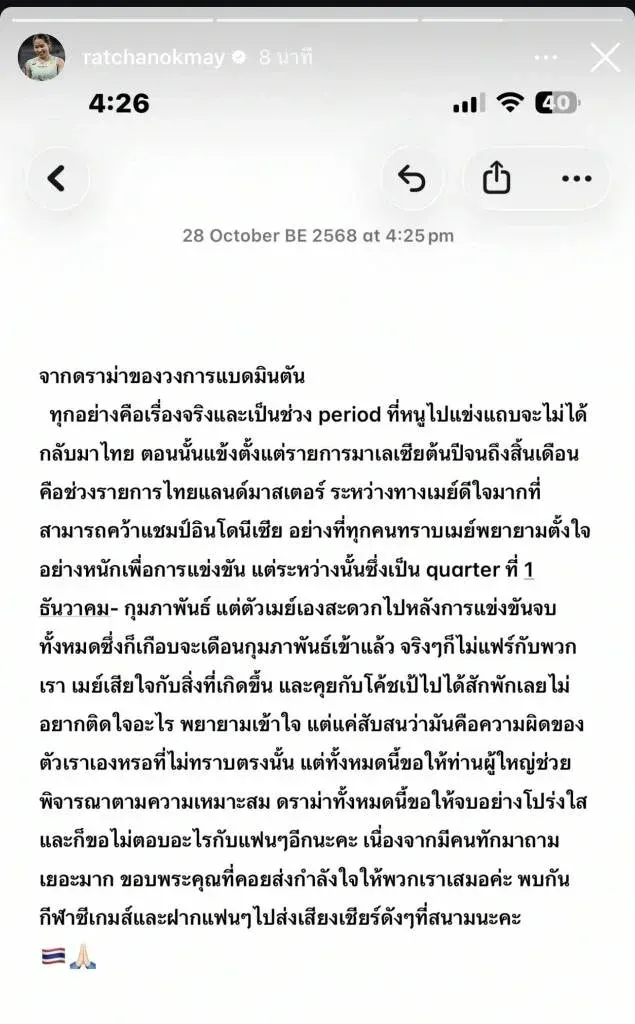 ท่ามกลางกระแสดราม่า “เมย์ รัชนก อินทนนท์” ได้ออกมาโพสต์ข้อความผ่าน Instagram Story เพื่อชี้แจงมุมของตัวเอง โดยเธอระบุว่า