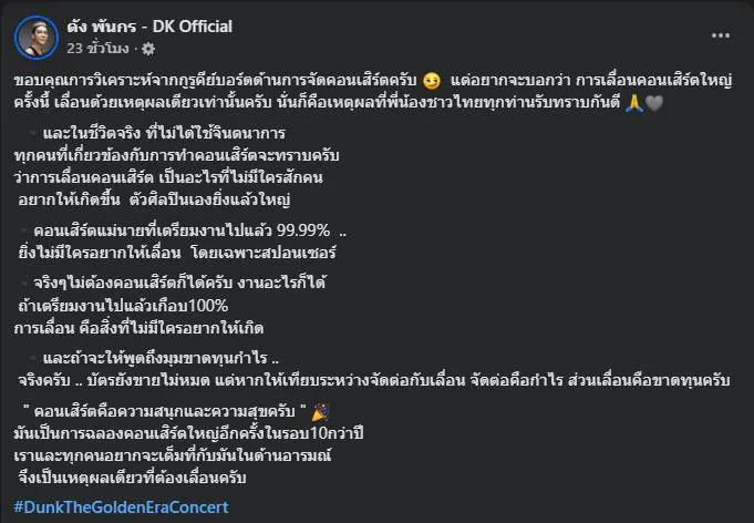 แถลงการณ์จากทีมงาน “DUNK PHUNKORN THE GOLDEN ERA CONCERT” ระบุอย่างชัดเจนว่า