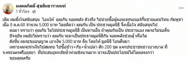 “เดิมผมตั้งใจสนับสนุน โอนให้คุณกัน จอมพลังตัวจริง ไปช่วยซื้อตู้คอนเทนเนอร์กั้นชายแดนไทย–กัมพูชา เมื่อวันที่ 8 ตุลาคม 68 จำนวน 5,000 บาท โดยคิดว่าคุณกันเป็นประธานมูลนิธิ จึงเชื่อใจและสนับสนุนไป แต่เมื่อมาทราบภายหลังว่าคุณกันไม่ใช่ประธานมูลนิธิ จึงขออนุญาตขอเงินคืนจากมูลนิธิครับ”