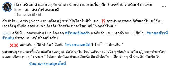 "ถ้าเข้าใจคำว่า 'ทำงานบนหลังคน' จะเข้าใจโลกใบนี้ขึ้นเยอะ ดราม่าแคะจมูกก็เริ่มเอาไปขยี้กัน จริง ๆ มันคือคอนเทนต์ ชีวิตจริงทำอะไรแบบนี้ให้ลูกค้าไหม? คลิปนี้ถูกถ่ายผ่าน Live TikTok ร้านจะปิดครัวพอดี แต่ลูกค้า VIP (ผีเป้า) มาขอข้าวที่ร้าน กินประจำ ทำให้ก่อนปิดร้าน คลิปเต็ม ๆ ก็มี แต่ช่วงกลางคลิปถูกตัดไปทำให้คนเข้าใจผิด"