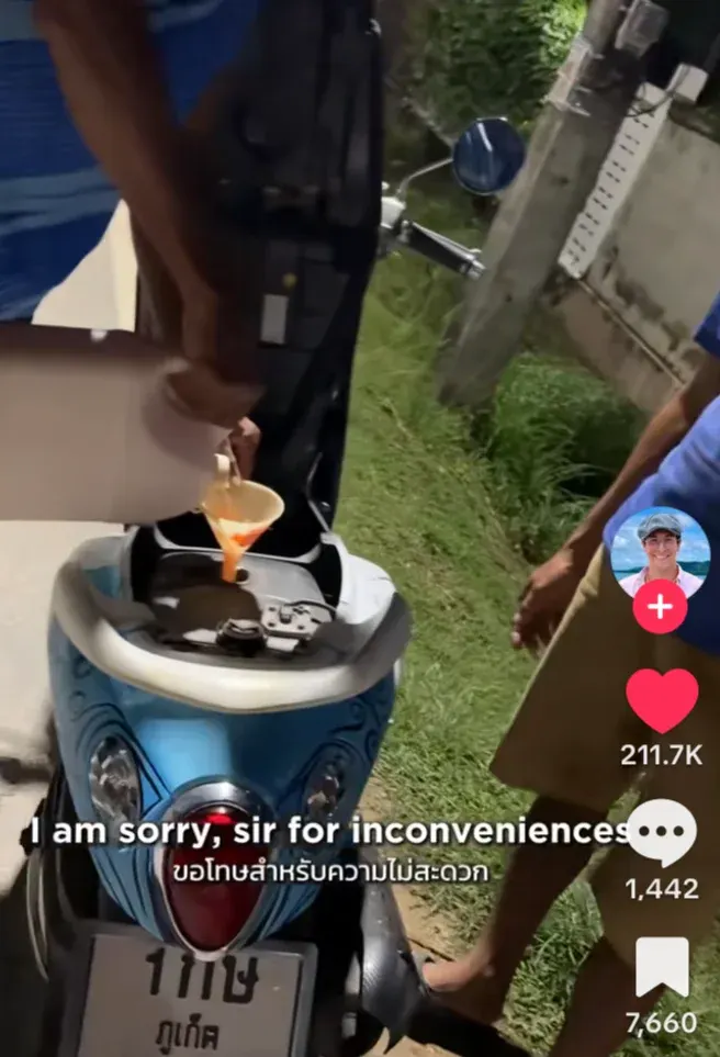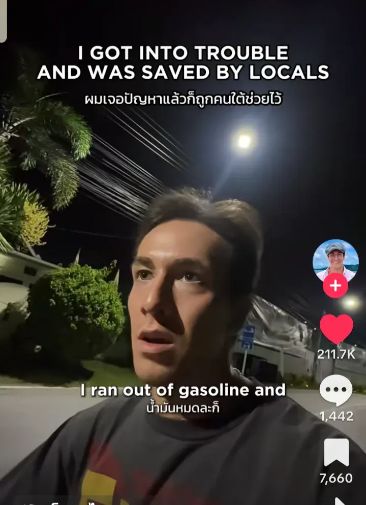 นักท่องเที่ยวชาวต่างชาติรายนี้เล่าว่า รถของเขาน้ำมันหมดกลางทาง และไม่รู้ว่าควรทำอย่างไรดี จึงตัดสินใจขอความช่วยเหลือจากคนไทยในพื้นที่
