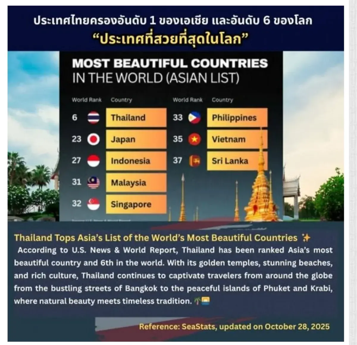 ไทย คว้าอันดับ 1 ในเอเซีย ประเทศที่สวยที่สุดในโลก