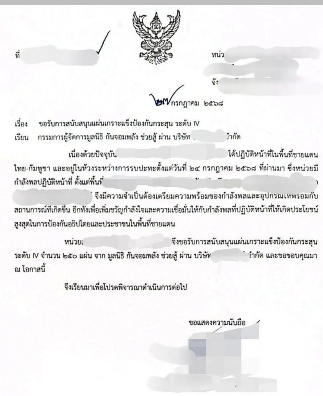 ‘กัน จอมพลัง’ โพสต์ หนังสือขอรับการสนับสนุนแผ่นเกราะแข็งป้องกันกระสุน ระดับ IV โดยหนังสือลงวันที่ 27 ก.ค.68 ถึง กรรมการผู้จัดการ มูลนิธิกัน จอมพลังช่วยส้ พร้อมระบุข้อความ