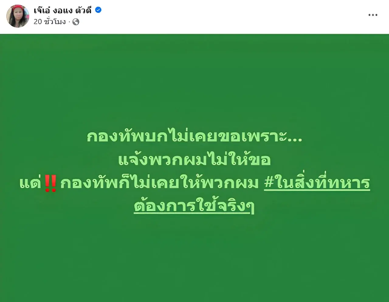 ประเด็นร้อนที่กำลังถูกพูดถึงในขณะนี้ ไม่ได้มีแค่ “คุณกัน” และคณะกรรมาธิการทหารเท่านั้นที่ออกมาเคลื่อนไหว ล่าสุด “เจ๊เอ๋” อินฟลูเอนเซอร์ชื่อดัง ซึ่งเคยลงพื้นที่ไปให้การสนับสนุนทหารตามแนวชายแดน ได้ออกมาโพสต์ข้อความผ่านเฟซบุ๊กส่วนตัวอย่างดุเดือด