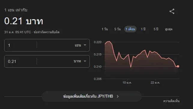 วันนี้ ค่าเงินเยนญี่ปุ่นอ่อนค่าลงอย่างรุนแรง ทำสถิติใหม่เมื่อเทียบกับเงินบาท โดยข้อมูลอัตราแลกเปลี่ยนล่าสุด ณ เวลา 12:43 น. เคลื่อนไหวอยู่ที่ 1 เยน ต่อ 0.21 บาท ซึ่งเป็นระดับที่อ่อนค่าลงต่อเนื่อง ตลอดทั้งเดือนตุลาคม...