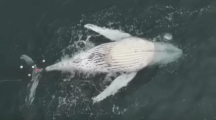 ซากวาฬตัวดังกล่าว ซึ่งคาดว่าอายุประมาณ 2 ปี ถูกพบที่ชายหาดวอมบาร์รา ทางตอนเหนือของเมืองวูลลองกอง โดยพบว่าหางและครีบของมัน พันติดกับตาข่ายดักฉลาม ซึ่งวาฬตัวดังกล่าว มีความยาวประมาณ 8 เมตร และ มีน้ำหนักหลายตัน เจ้าหน้าที่ไม่สามารถกู้ซากได้ในทันที เนื่องจากสภาพอากาศไม่เอื้ออำนวย