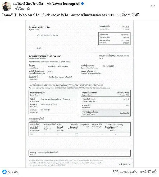 เพื่อความโปร่งใสและไม่ให้เกิดความเข้าใจผิดในวงกว้าง “บอสณวัฒน์” จึงได้โพสต์ข้อความประกาศชัดว่า จะ คืนเงินทุกบาทที่ไม่ได้อยู่ในกระบวนการบริจาคที่ชัดเจน กลับไปยังเจ้าของบัญชีเดิม