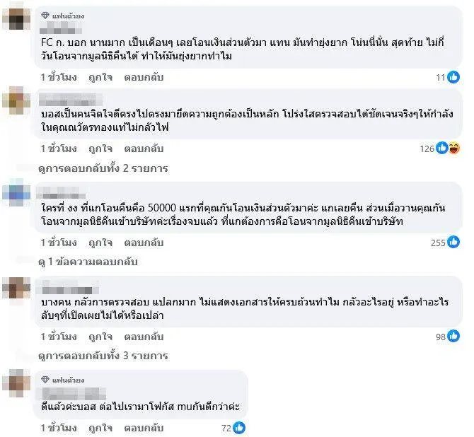 ในขณะเดียวกัน ยังมีผู้ติดตามบางส่วนที่เข้ามาตั้งคำถามเพิ่มเติม เช่น “แล้วเงินที่มูลนิธิ โอนกลับเข้าบริษัทเมื่อวานคืออะไร?” ซึ่งก็มีแฟน ๆ ของบอสณวัฒน์ช่วยอธิบายว่า
