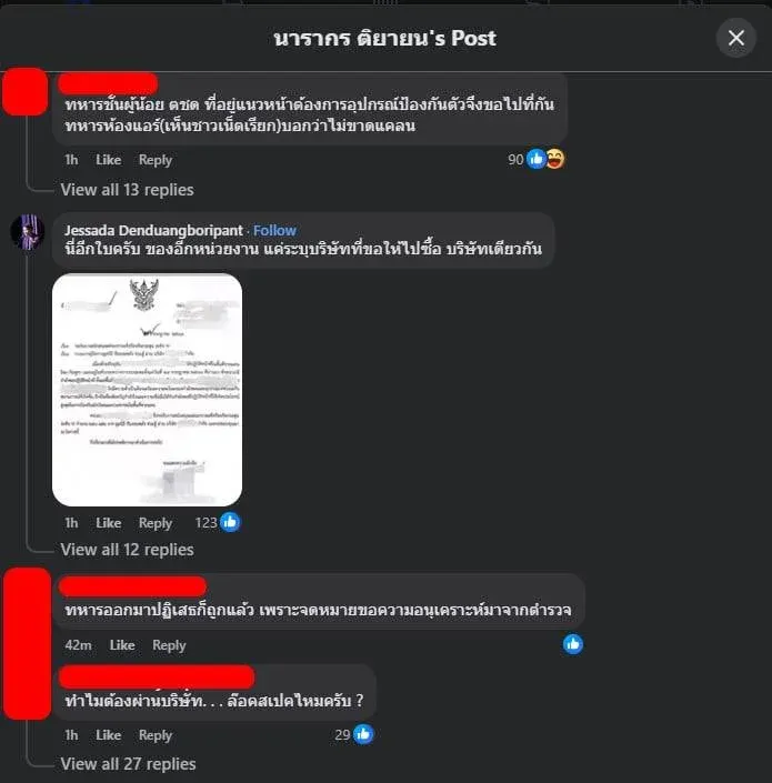 ผู้ประกาศข่าวชื่อดังได้เผยแพร่ภาพเอกสารทางราชการอย่างเป็นทางการ ระบุหัวเรื่องว่า “ขอรับการสนับสนุนแผ่นเกราะแข็งป้องกันกระสุน ระดับ IV” โดยในเนื้อหาของเอกสารนั้นมีรายละเอียดครบถ้วน ตั้งแต่หน่วยงานต้นทาง ไปจนถึงผู้รับปลายทางอย่างชัดเจน