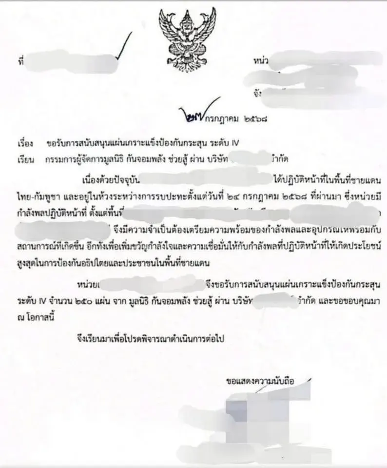19 สิงหาคม 2568: กองร้อย ตชด.22 ทำหนังสือขอรับการสนับสนุนแผ่นเกราะ 22 แผ่น ผ่านมูลนิธิ กัน จอมพลัง